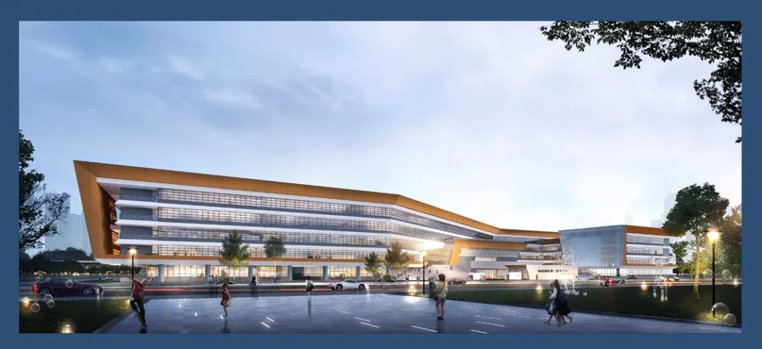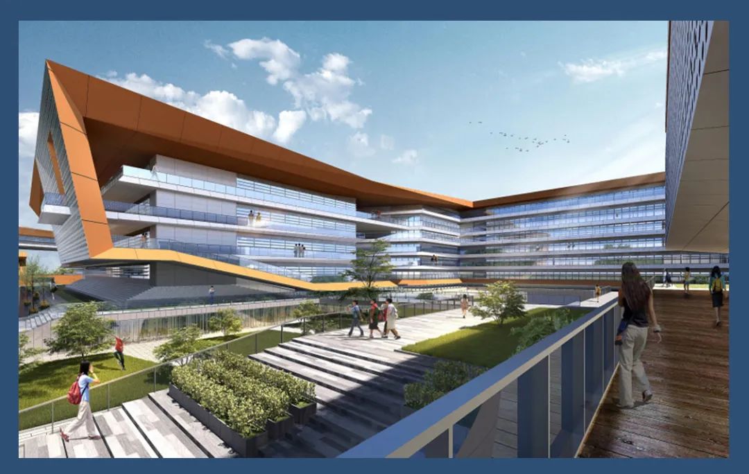 整體造型以現(xiàn)代風(fēng)格為主,建筑通過形體的穿插,材質(zhì)的變化,空間的虛實對比,形成輪廓清晰,形體鮮明的整體校園形象。白與橘黃的色彩搭配,使建筑充滿學(xué)習(xí)氣氛,融入優(yōu)美的自然景觀之中,親切宜人,富有活力。
