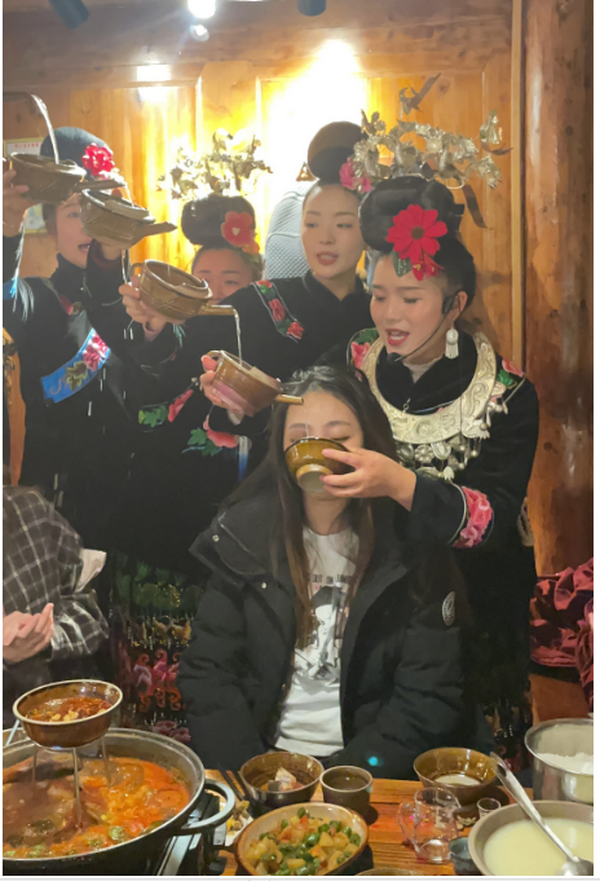 第三天乘車前往天下第一大苗寨--【西江千戶苗寨】到達景區,在此感受著濃郁而古樸的悠閑農居生活,這里民風淳樸,人人都會吹奏蘆筍、跳蘆笙歌舞,又稱為“蘆笙的故鄉、歌舞的海洋”。整個寨子處于群山環抱當中,苗寨全都依山而建,層層又疊疊、錯落有致,遠遠望去,只見翠山綠葉中,分散著青黑色的幢幢矮樓,仿如世外桃源。晚餐享用苗家特色餐—【長桌宴】,喝苗家香【醇米酒】,聽苗家阿妹原生態--【敬酒歌】