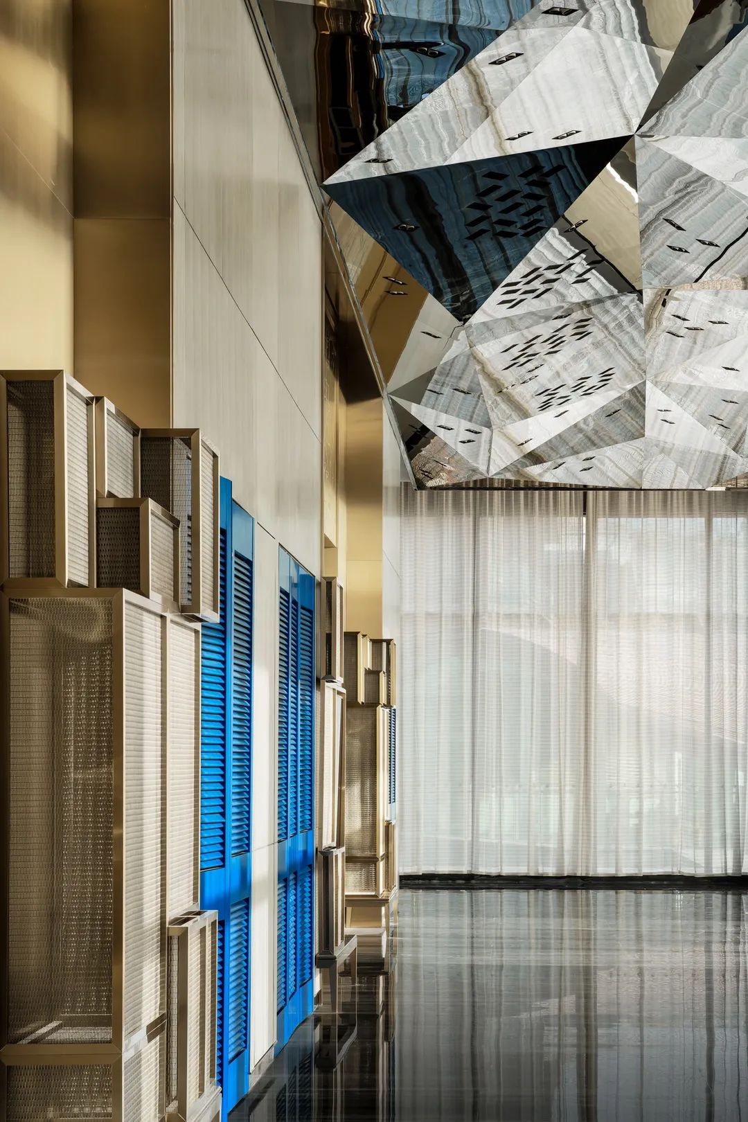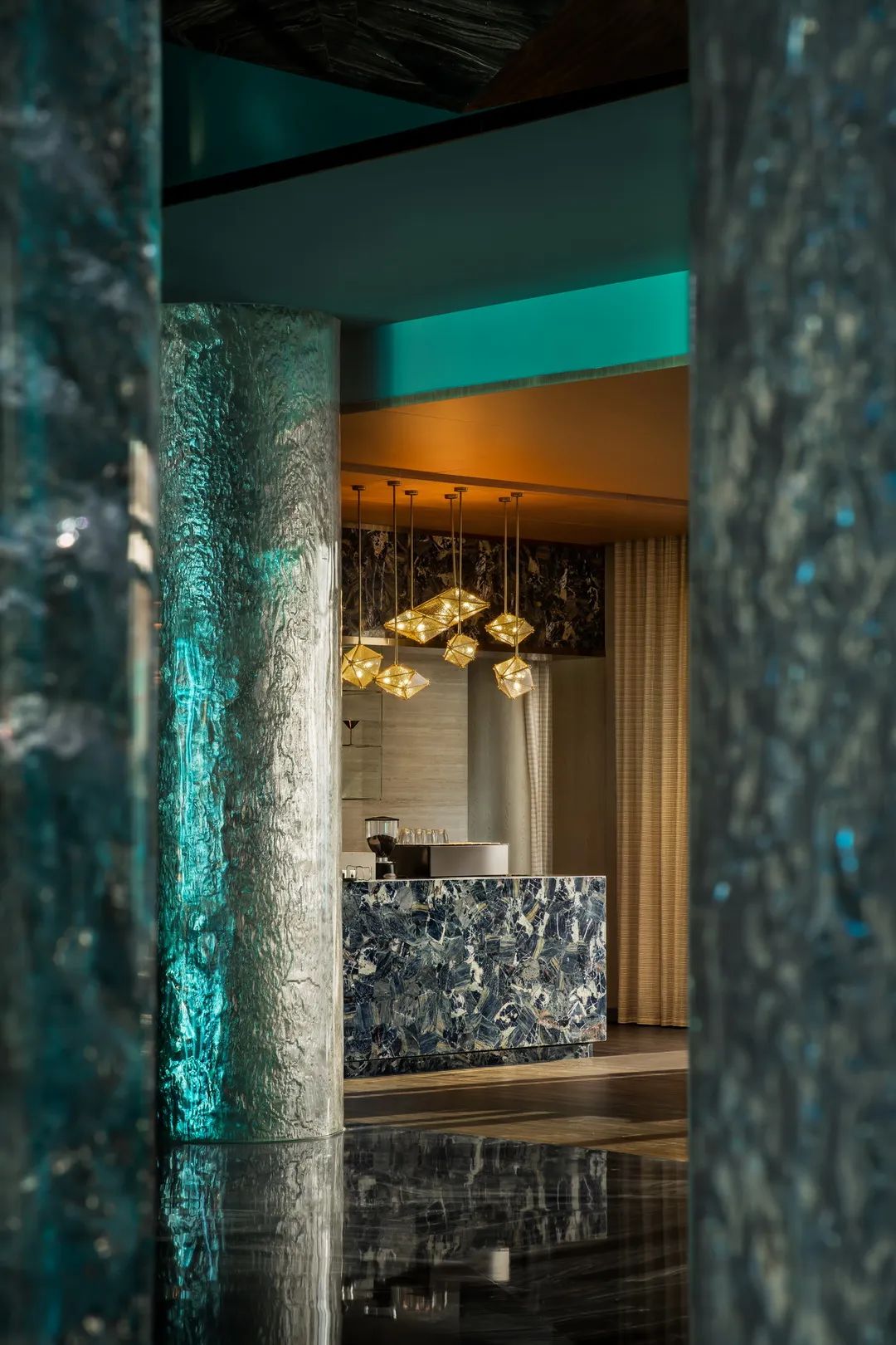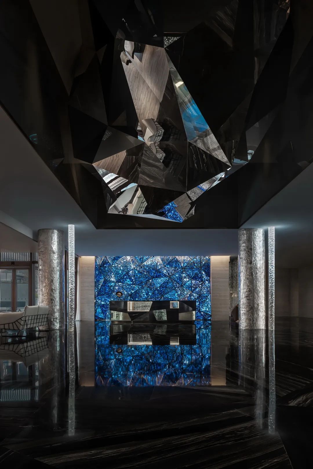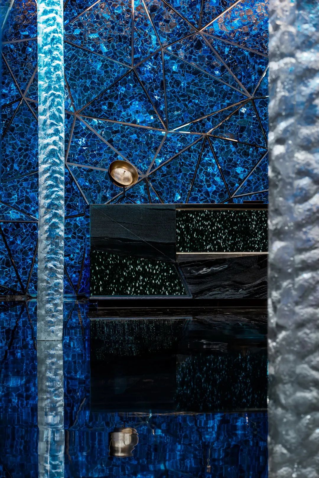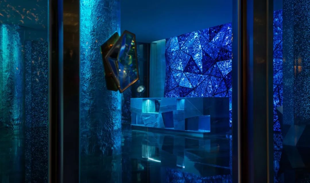 總臺后一叢叢青金石粗糲生長,光河在棱角中沖撞,仿若繪制中的梵高星空,靜謐燃燒宇宙的弦。平滑如鏡的大理石地面,不動聲色地照映萬物,模糊了虛實界限。