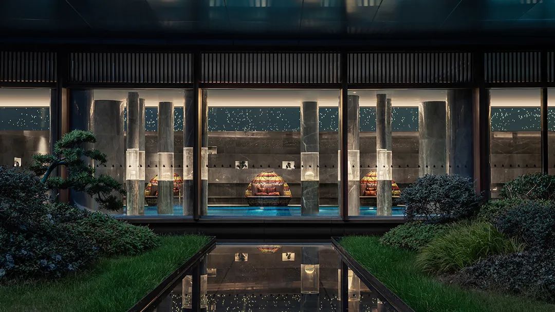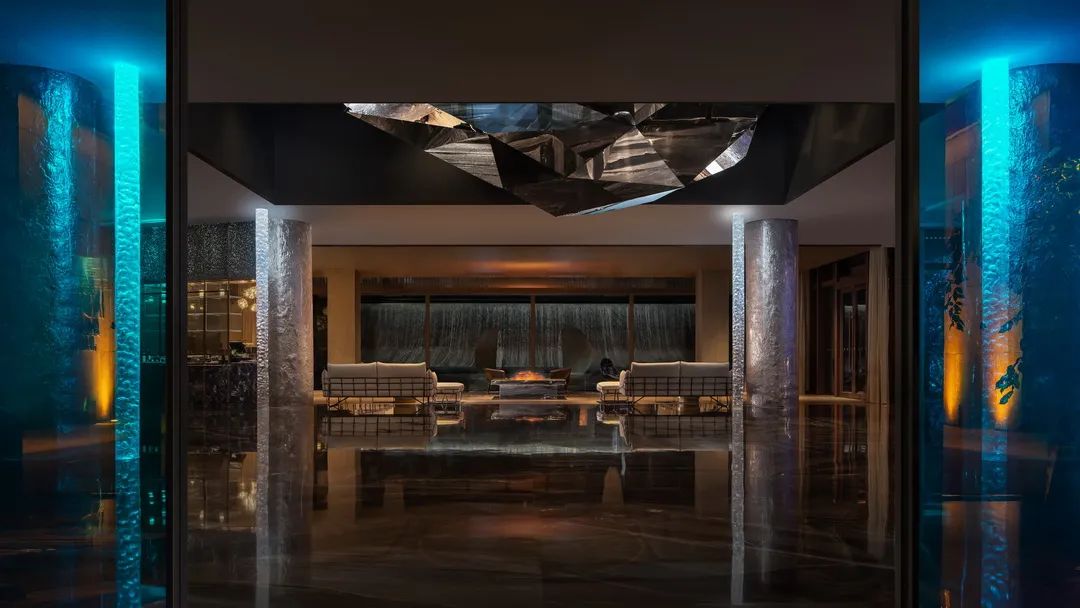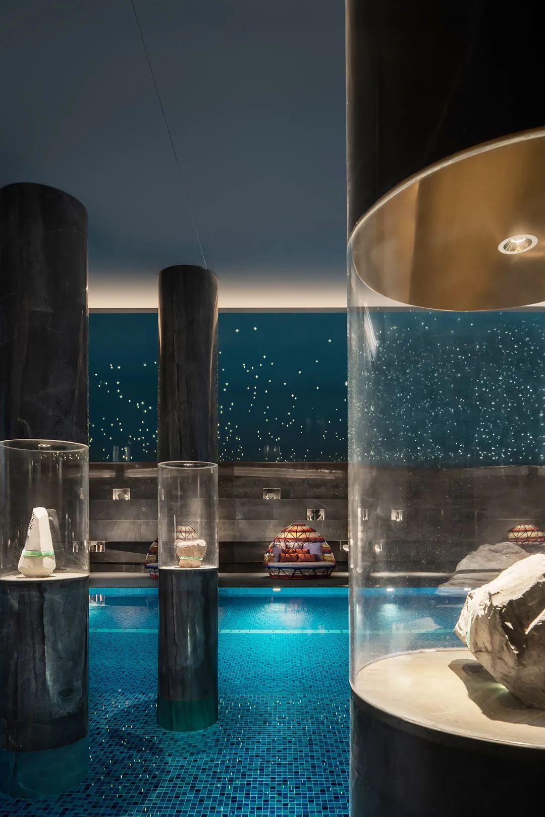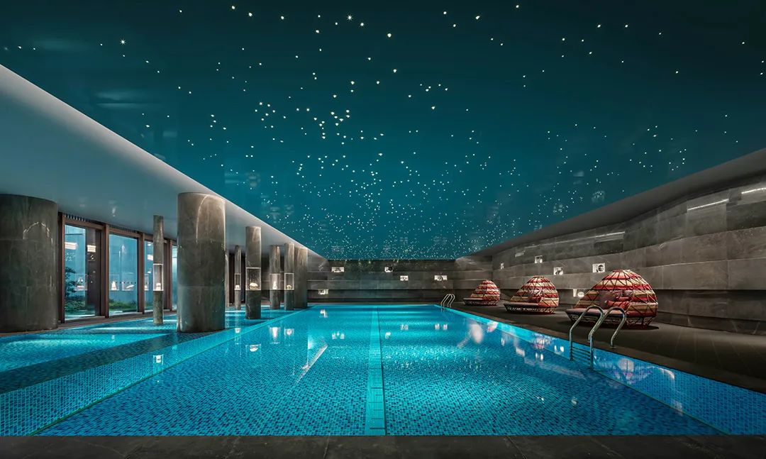 就連泳池,也懸垂銀河天象,珍藏著不同地質年代的礦物標本。層層堆疊的地幔環(huán)繞,如置身幽深礦谷。星光傾瀉,鑿空這片深邃的昏暗。