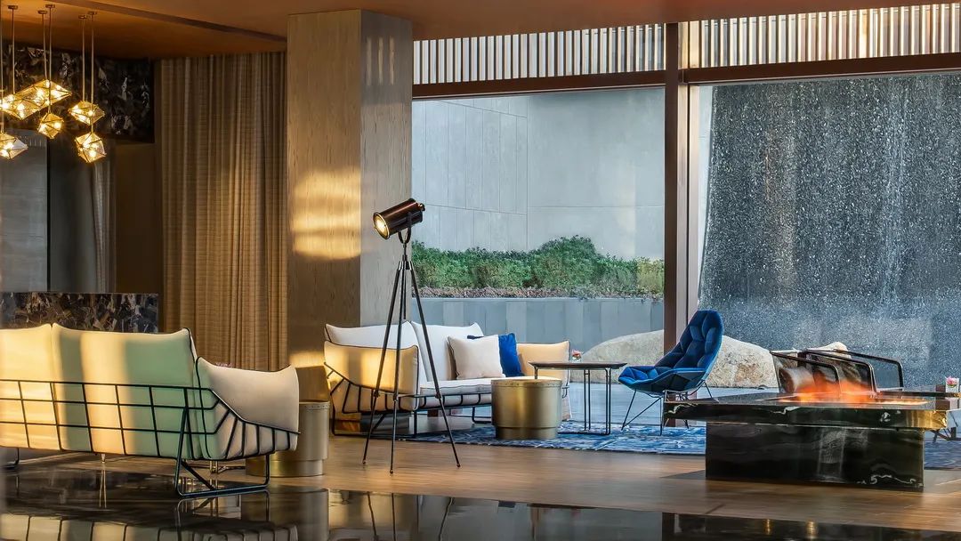 相比冷峻迷幻的大堂空間,YANG為大堂吧賦予了更多的溫情。棕褐木質地面、象牙白暗紋呢沙發(fā)、復古暖光的垂吊礦燈……熊熊熾熱的篝火,暈出黃昏的朦朧輪廓。窗外水簾慵懶地哼吟石間,歲月緩緩沉淀,邀你慢下來。