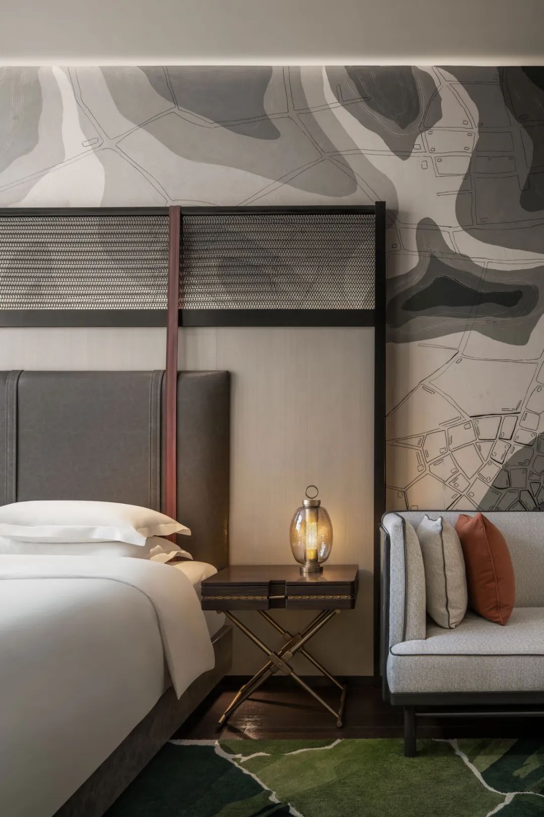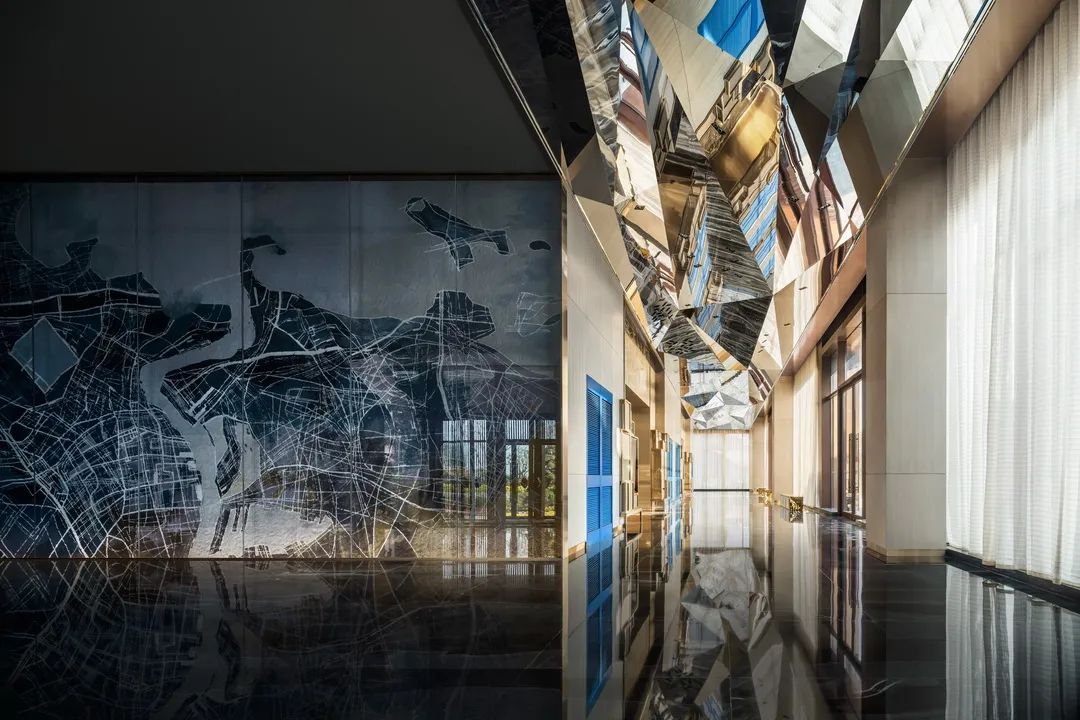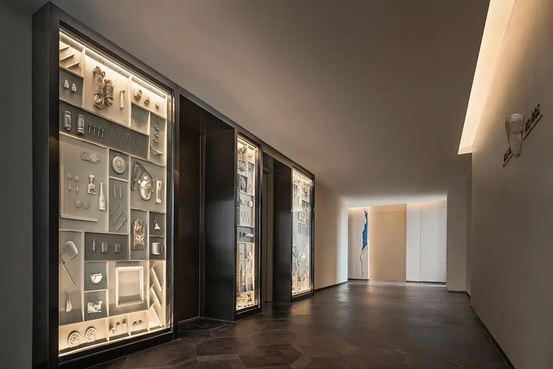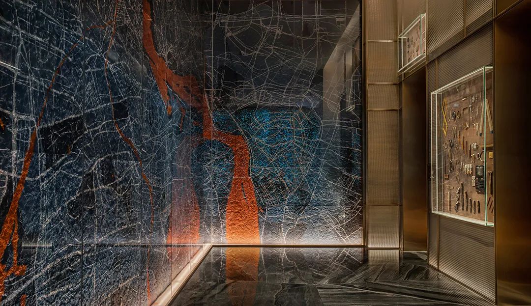 當大地側了個身,將山河走向、地質肌理坦露于墻,送來城市生長變遷的信息,你會不自覺沉迷靜思。常規(guī)的宴會電梯廳前,YANG別出心裁引入地形圖譜,激發(fā)驚喜。