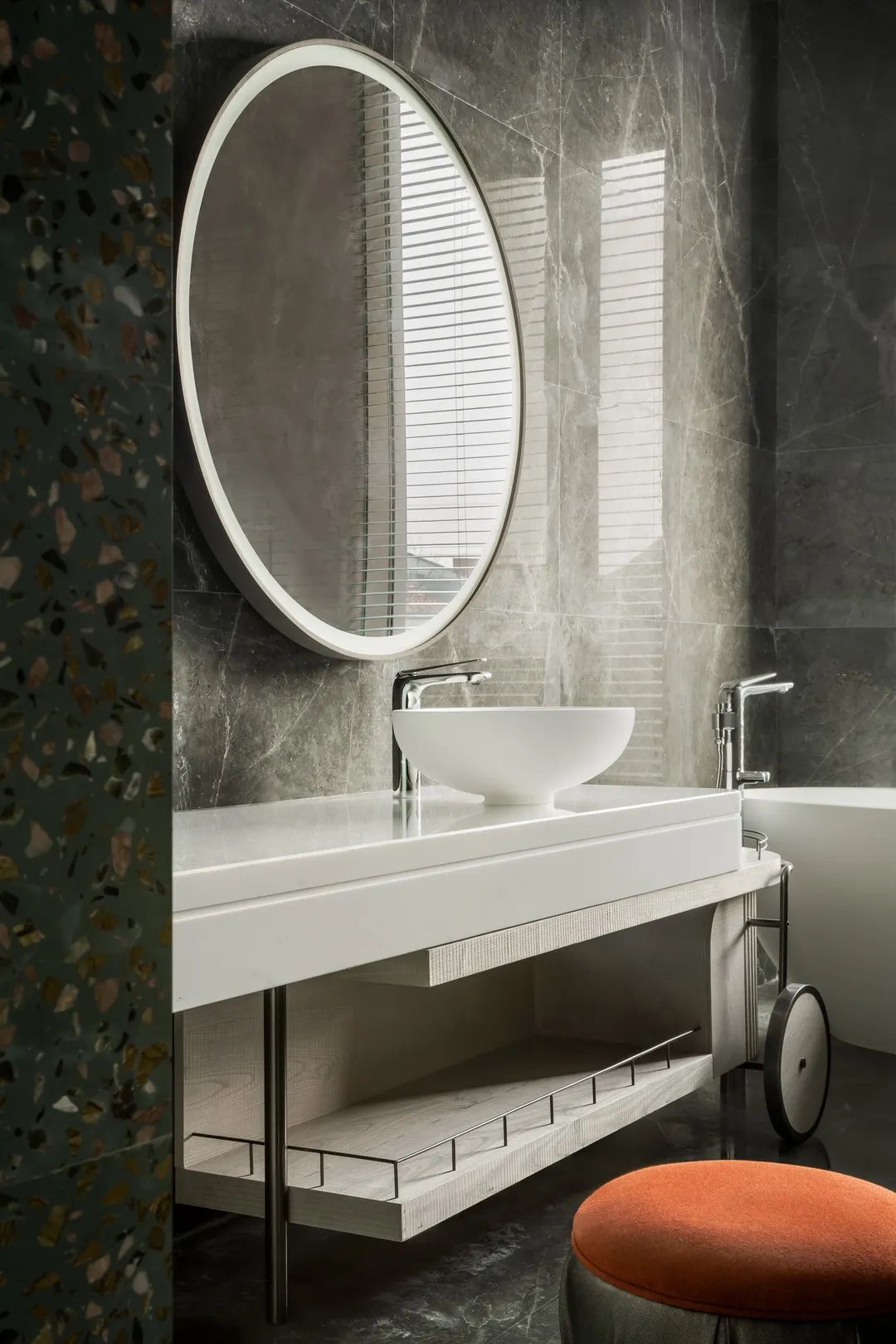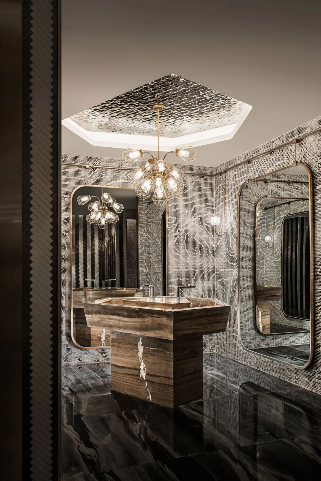 礦巖結構的洗手臺、地形紋理的馬賽克墻設計連續(xù)且細密
