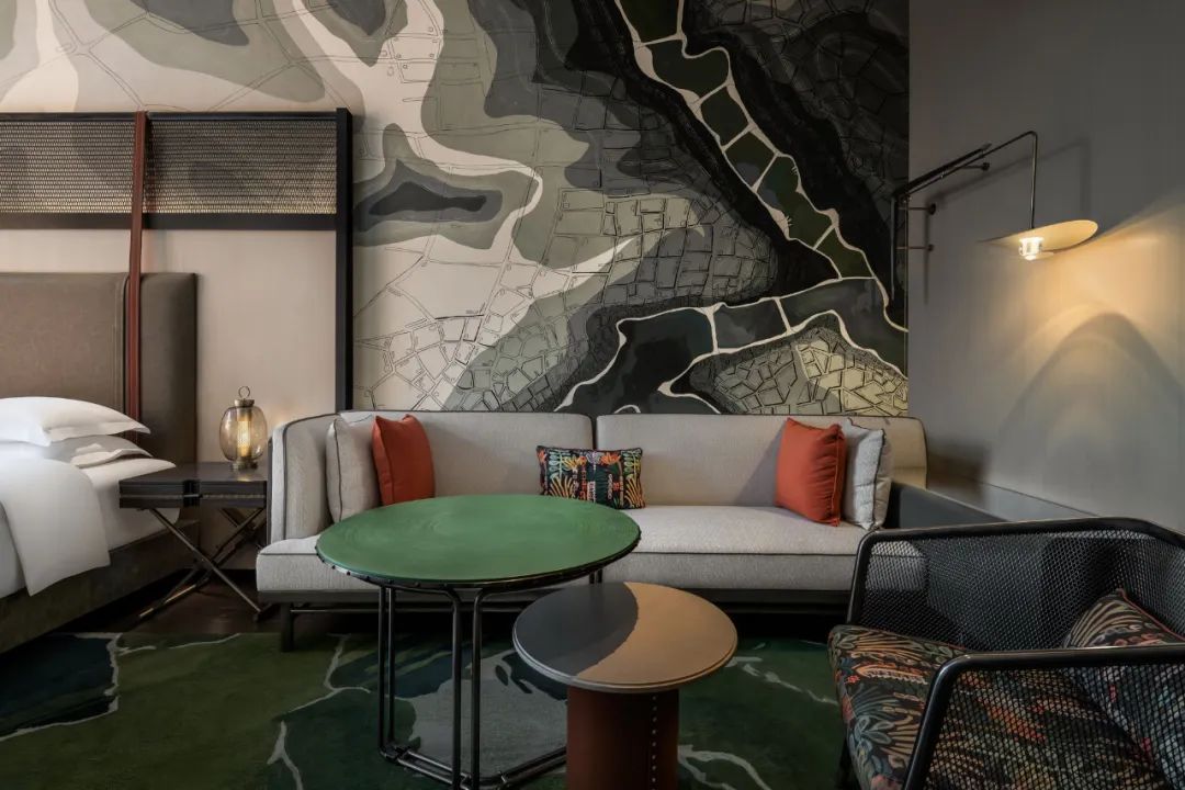 門前剝裂的巖石層,是地球傷口的隱喻。蔥綠侵染的城市地貌、青苔綴連的地毯、植被盛開的抱枕、森林氤氳的衣帽間……預演著礦野新生。礦物工具箱化身迷你吧、床頭柜,滿載湯山鄰里的往事。
