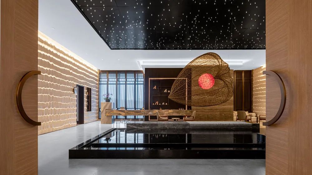 酒店采用獨(dú)特的雙大堂設(shè)計,首層大堂以“胡同”為主題,連接著世外桃源和別有洞天的謐境,穿過高高的木扇門,9m的高空星羅棋布的星光繪制成蓉城的地圖,天地交融韻味獨(dú)特,貼心的地暖設(shè)計讓溫度和濕度都仿佛置身桃花園中溫暖的家。