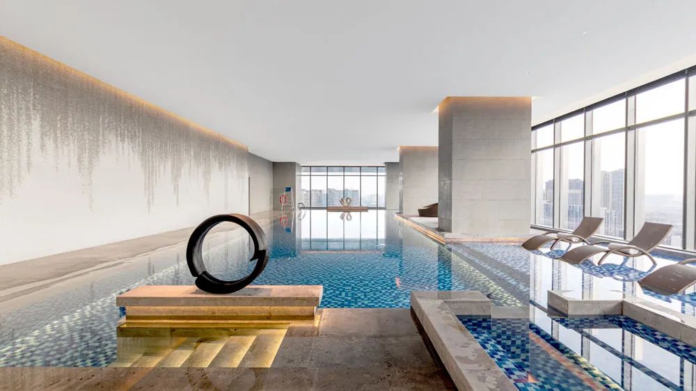 位于18層的養(yǎng)生中心以“庭院下溫暖的夜光”為靈感,在600㎡的空間中將山之自然,水之靜謐化作空間意境,300㎡的云端無邊際恒溫泳池讓賓客仿佛置身于“雨下的庭院”。